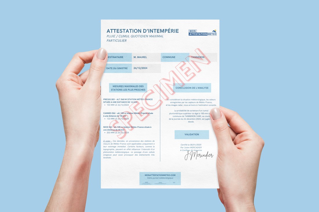 Après une tempête, un épisode de pluies intenses ou de grêle, votre assureur vous demande de prouver la réalité du phénomène climatique. C'est précisément notre métier. À partir des relevés de Météo-France, nous établissons une attestation d'intempérie qui certifie les conditions météorologiques exactes à la date et au lieu de votre sinistre. Un document reconnu par l'ensemble des compagnies d'assurance, livré sous 24 à 48 heures.
